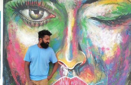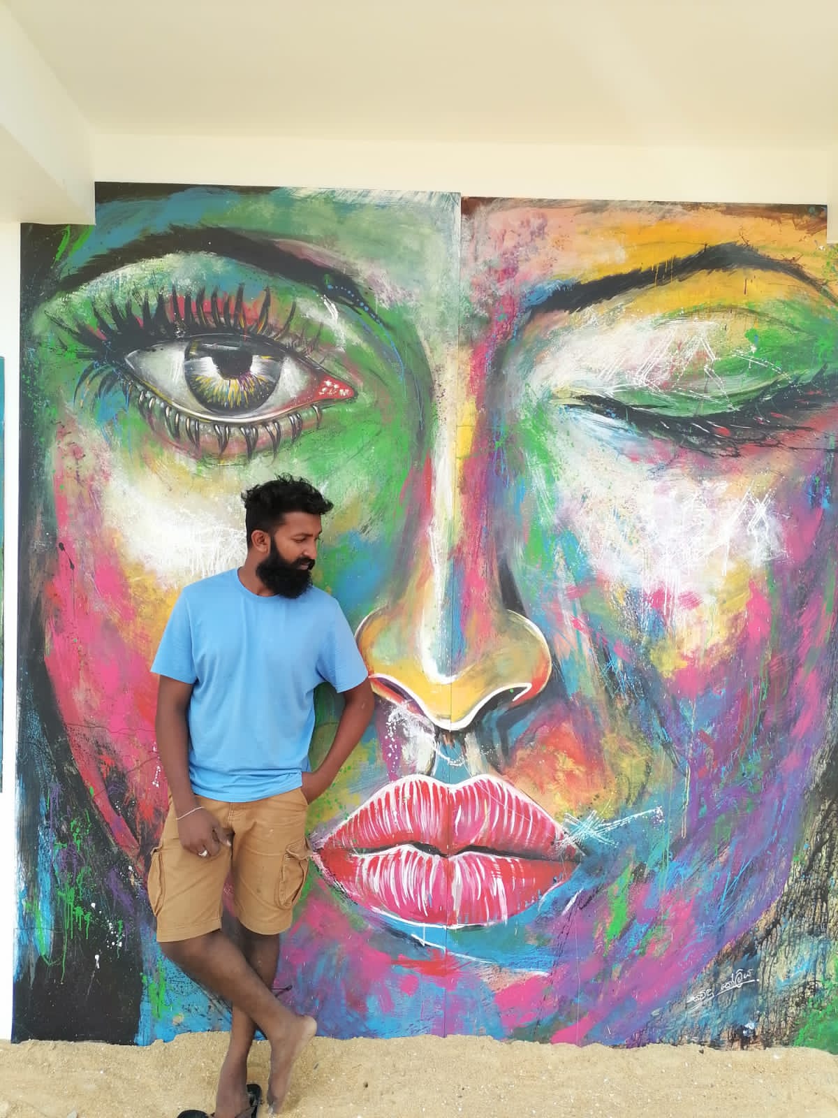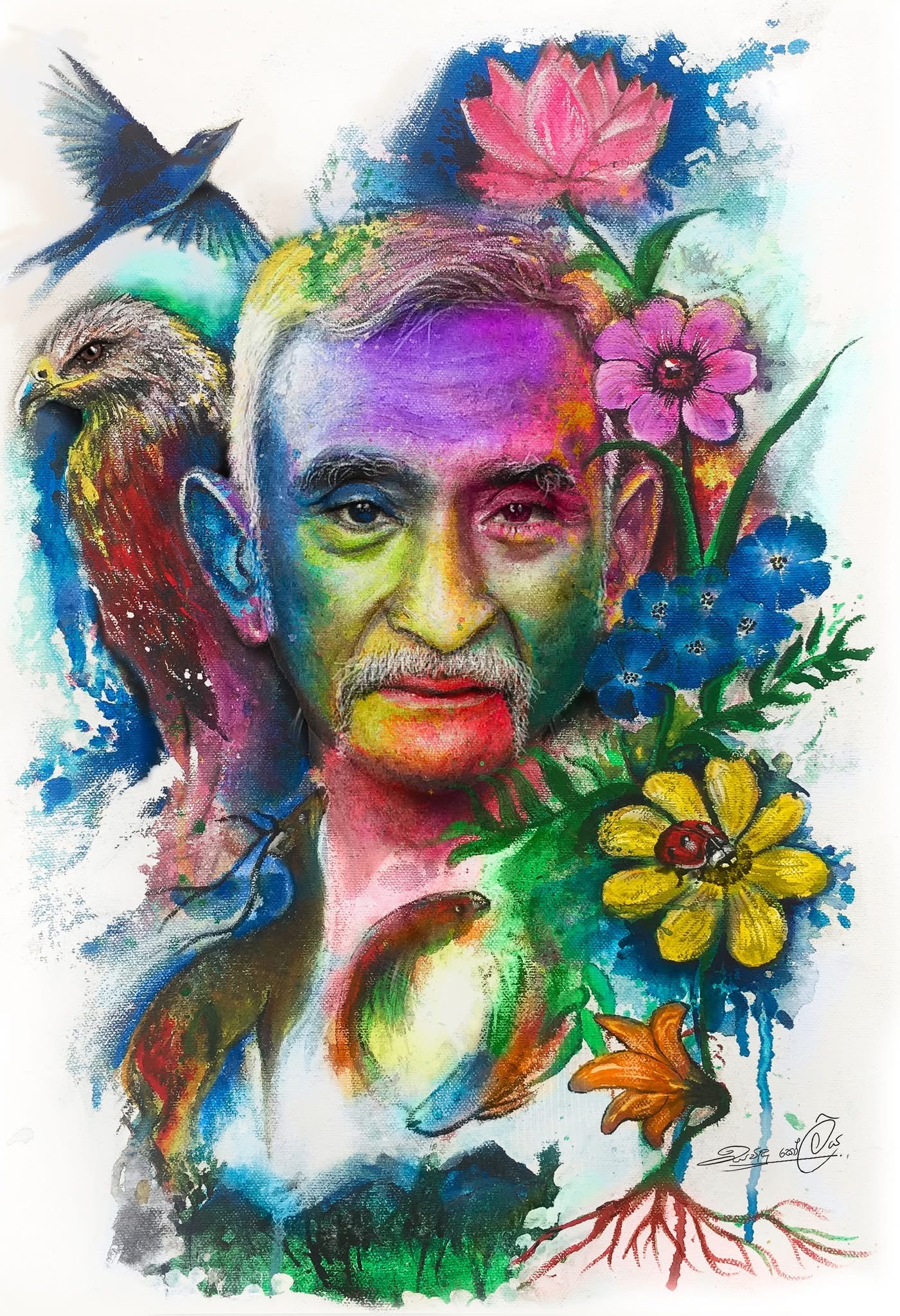 A colorful acrylic portrait of environmentalist Mr. Jagath Gunawardana, blending spiritual energy, flora, fauna, and symbolic elements that reflect his deep connection with nature and consciousness.