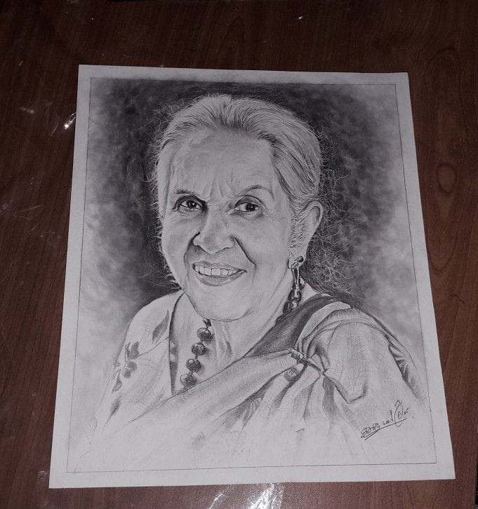 A detailed pencil portrait of Iranganie Serasinghe, capturing the grace, wisdom, and artistic legacy of one of Sri Lanka's greatest actresses.a